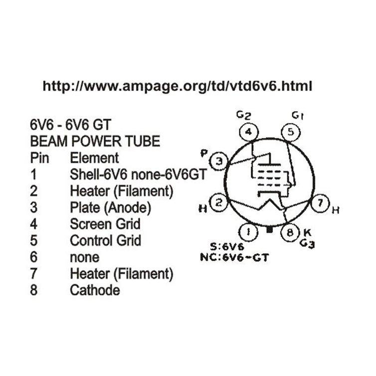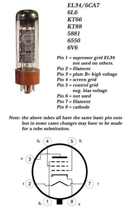 As I am using 6V6s in place of the EL84s in this amp (similar specs), I have to translate the pins. To use an EL34 in place of a 6V6 (check power and current ratings of your PT first!), pins 1(suppressor) and 8 (cathode) must be connected together.