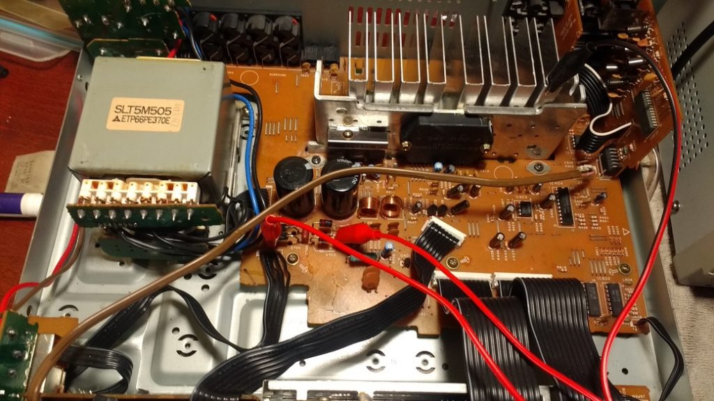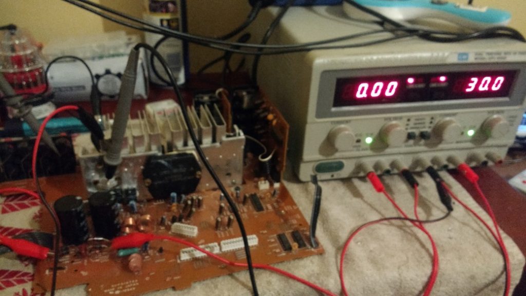 Once soldered back the main board powered and drew about 4mA - same as the SA5L. Positive 30V is red on the left of the diodes, negative 30V right, black ground is on the heatsink. (Don't always assume the heatsink or chassis IS ground though - ground may be floating on some equipment)
