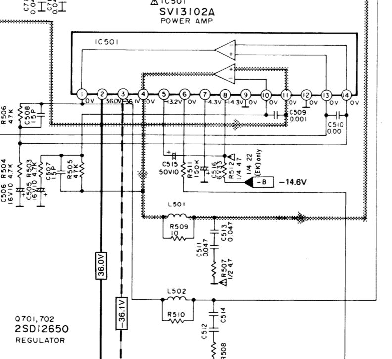 It has +/-34 and -15V but no +15V to it's pins which is correct from the sux840 SVI3102A pinouts :