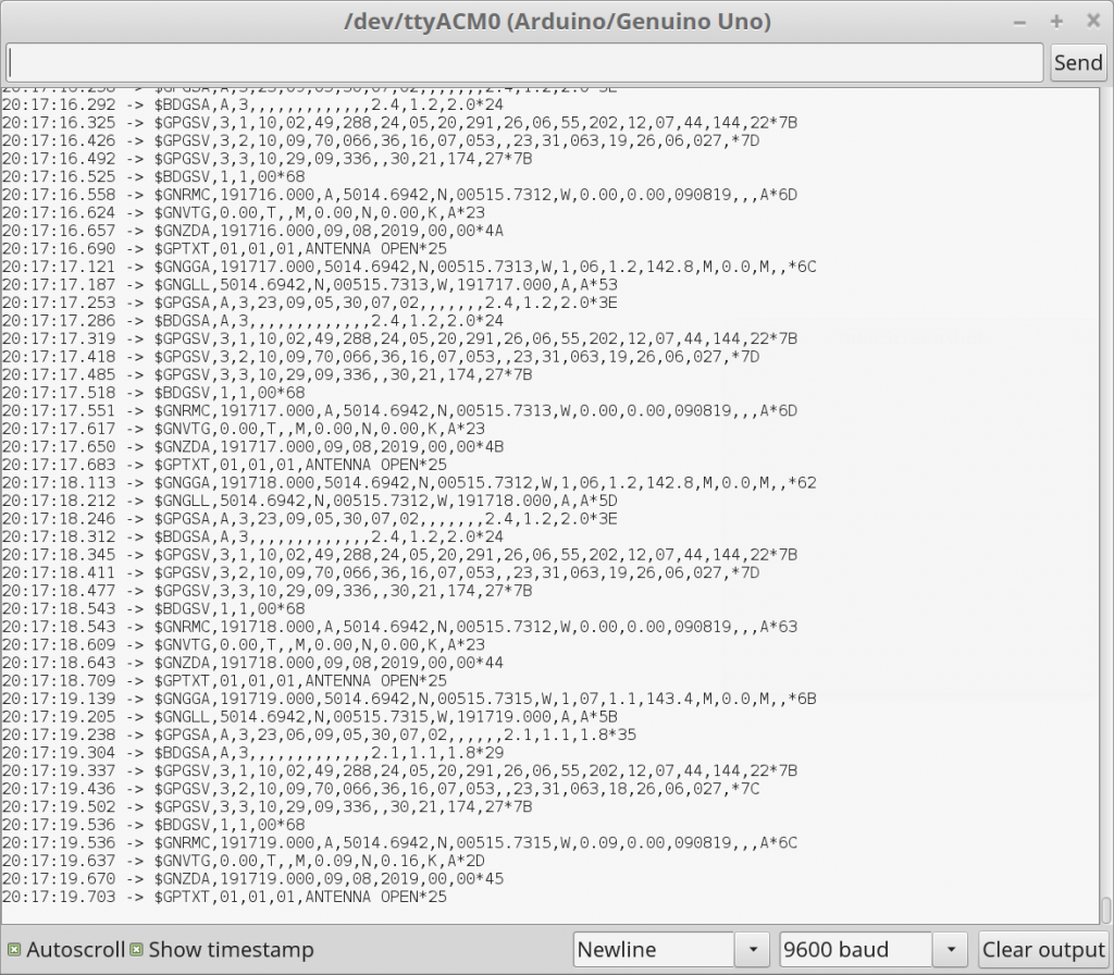 NB:-  the TX pin flashing on the Uno means it is transmitting the data FROM the GPS module TO the PC.