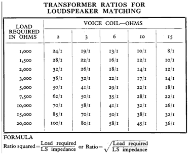 So there is a proportional relationship between voltage and current if power output is the same for each winding which it is in a "perfect" transformer as both primary and secondary sides share power equally. The primary voltage goes across the power valves but a relatively low current flows on this side, as with the Laney example, 1V measured across the cathode resistor of 5 ohms gives about 0.2 amps, though the voltage across them may be above 400V RMS as in the calculation in the previous Post for a 10:1 step down ratio for 16 ohm tap from the Briggs chart below and square of the turns ratio (10 x 10 = 100, x 16 ohms speaker load = 1600 ohms valve load) explained above: