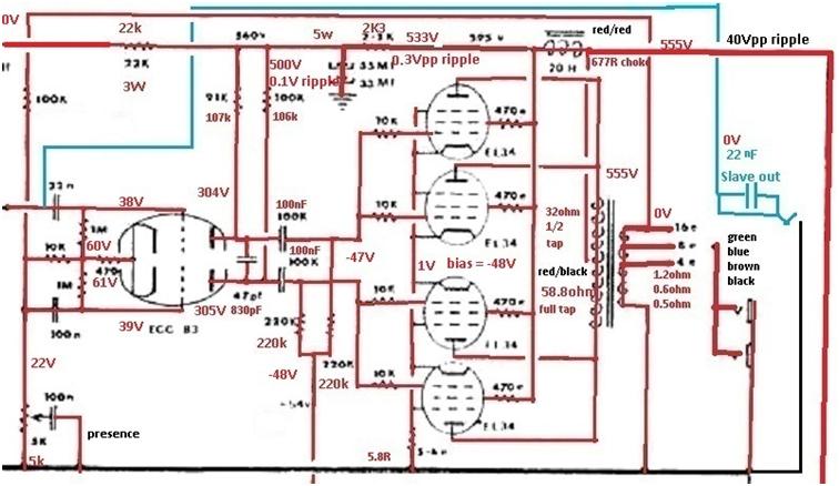 The 2 x 30W, 16 ohm speakers that were in the cab were wired in parallel and plugged in with the 16 ohm output selector link set. The 8 ohm position is riveted closed even though the schematic has 8 ohm as an option - which is what it should have been set to, so these are the wrong (16 ohm) value speakers for an amp of this power in the first place as will be explained below.