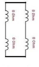 If these were 16 ohm speakers in the above diagram, you would two pairs at 2 x 16 ohm in series = 32 ohms, then wired in parallel to give 16 ohms overall. All four in parallel you would get 4 ohms.