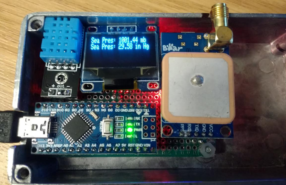 Packed in a Neo6 GPS, BMP180, DHT11 and OLED screen controlled by a Nano fixed into female headers for easy component swap out and height gain- shame about my engineering skills, but..it works, and finally used that 6 year old project box..: